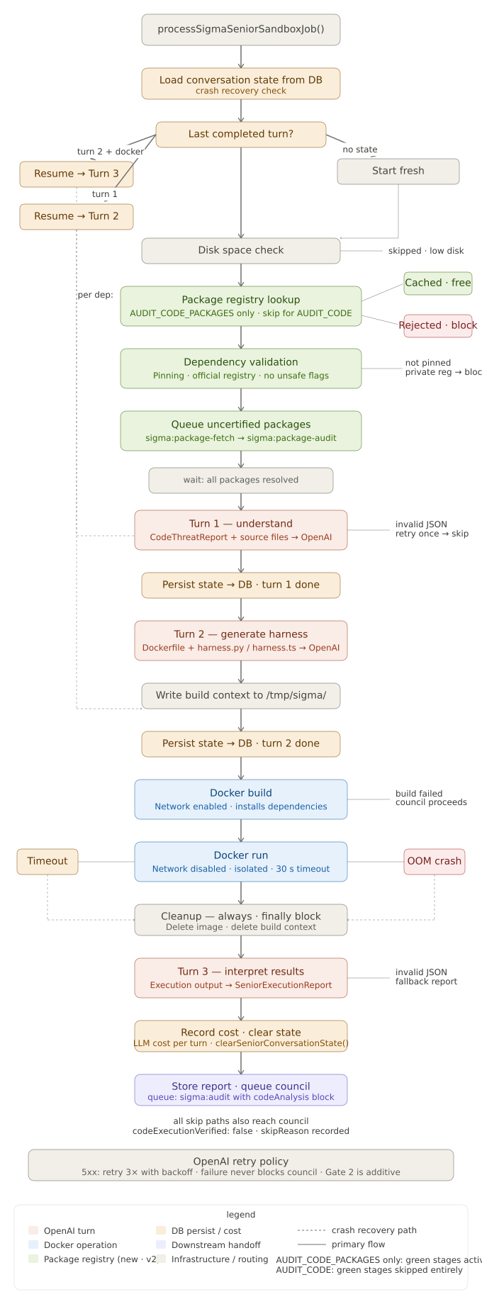 If the Senior fails for any reason — API unavailability, inability to generate a harness, execution timeout — the submission is not blocked. The council proceeds with the Layer 1 static analysis data. The certificate records that sandboxed execution was skipped and explains why.